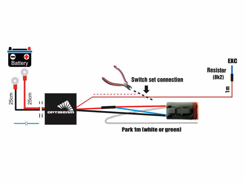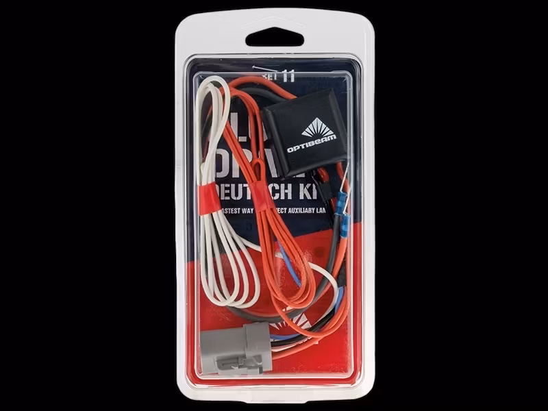 Plug&Drive, for one additional light, Deutsch connector, CAN-compatible, corrosion-resistant, fully electronic design, replaces both fuse and relay. Built-in ground fault protection. Also works in vehicles where power is supplied in pulses to the headlights. 12V:300W, 24V:600W. Deutsch wiring kits for additional lights, utilizing modern semiconductor technology, save time and costs while ensuring reliable moisture-resistant connections for all types of auxiliary light combinations.